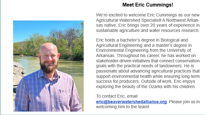 Arkansas Environmental Personnel Moves: Eric Cummings Named Beaver Watershed Alliance Agriculture Watershed Specialist