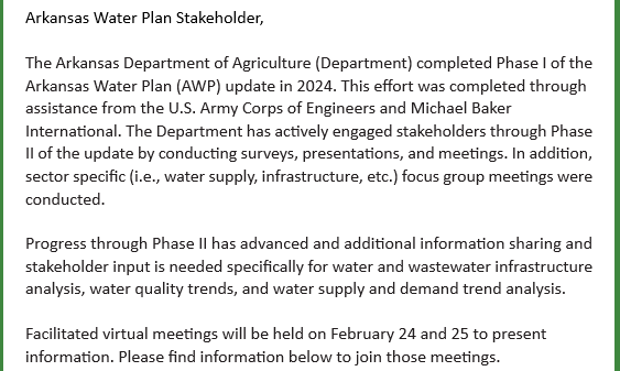 The Arkansas Department of Agriculture (“ADA”) announced that it will facilitate virtual meetings that will be held on February 24th and 25th as part of its process for updating the Arkansas Water Plan (“AWP”).