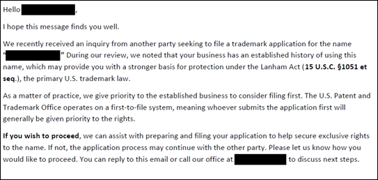 An example of a common trademark scam email can be seen below.